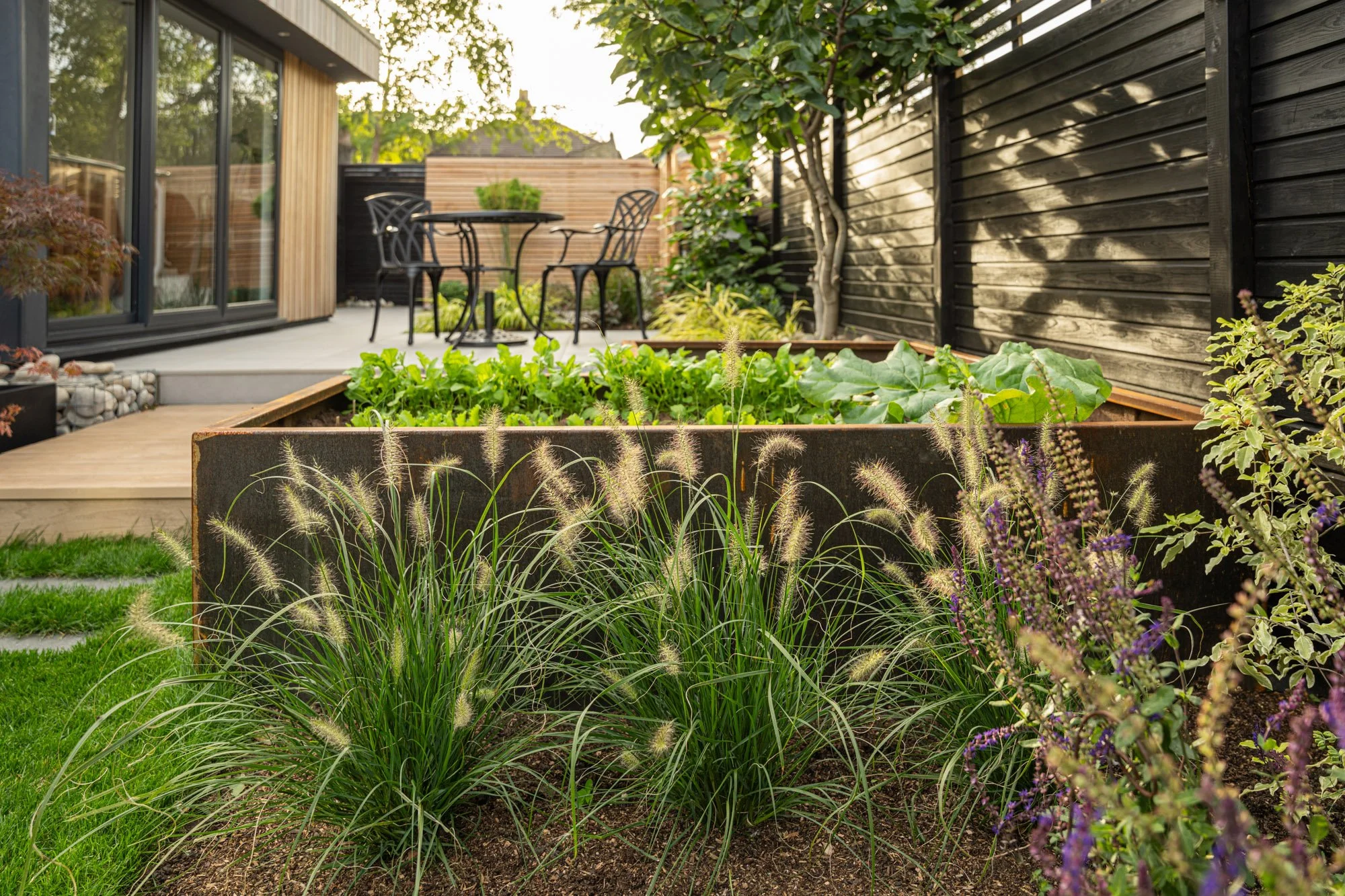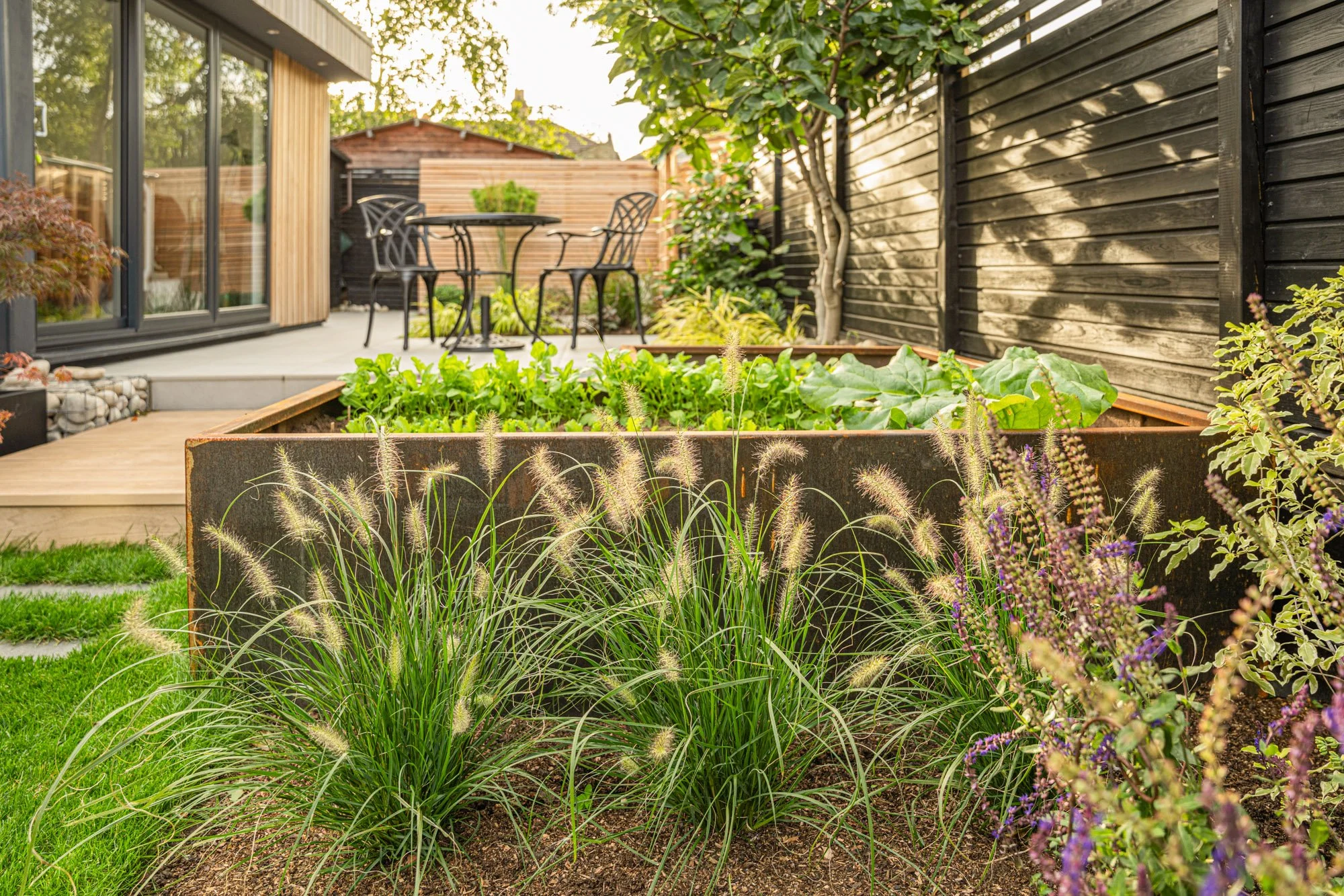 Many of us have been on a journey from the house to the garden office over the past few years. This morning commute to work is now a multi sensory experience with stone, hardwood, lawn and corten steel en route.